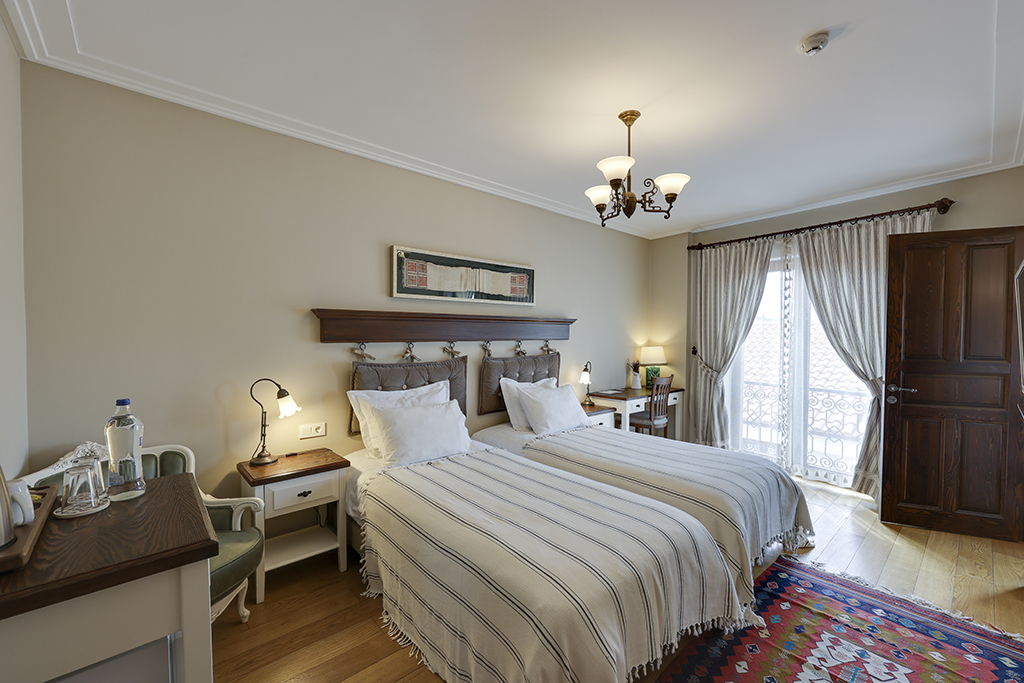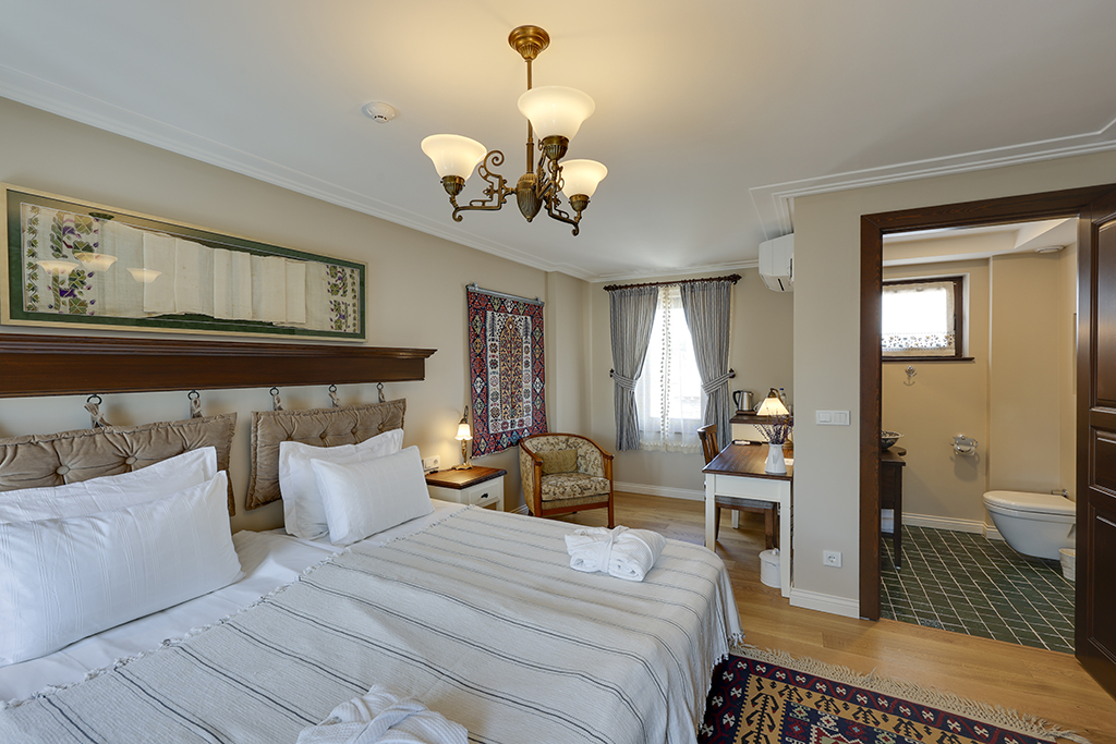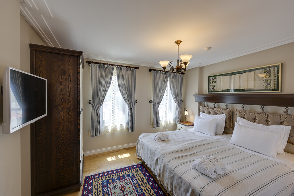 Some of our rooms have bay windows (Cumba) with sofa beds as frequently used in traditional Turkish architecture and authentic handicrafts, carpets, rugs, copper / silver and hand weaves are evident through the whole hotel.