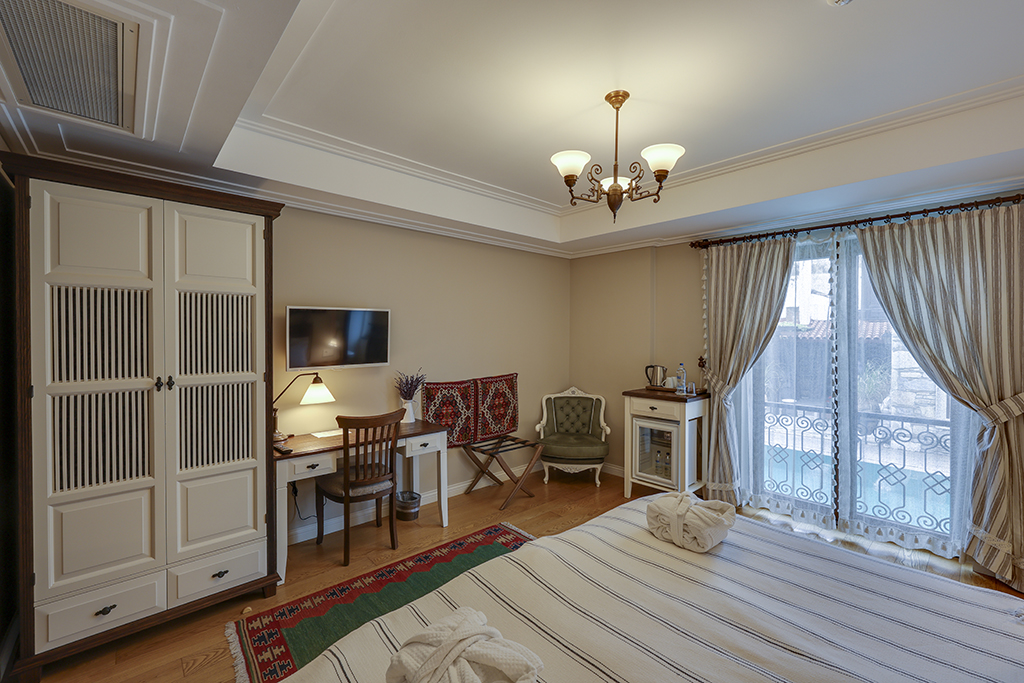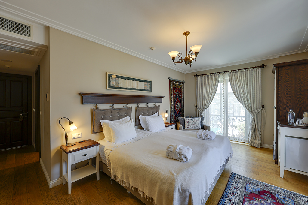 Some of our rooms have bay windows (Cumba) with sofa beds as frequently used in traditional Turkish architecture and authentic handicrafts, carpets, rugs, copper / silver and hand weaves are evident through the whole hotel.