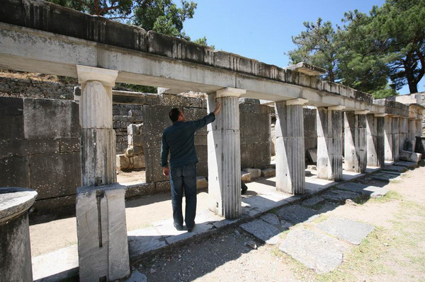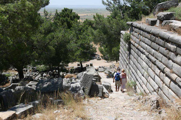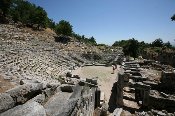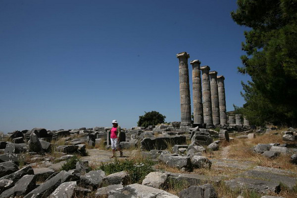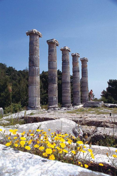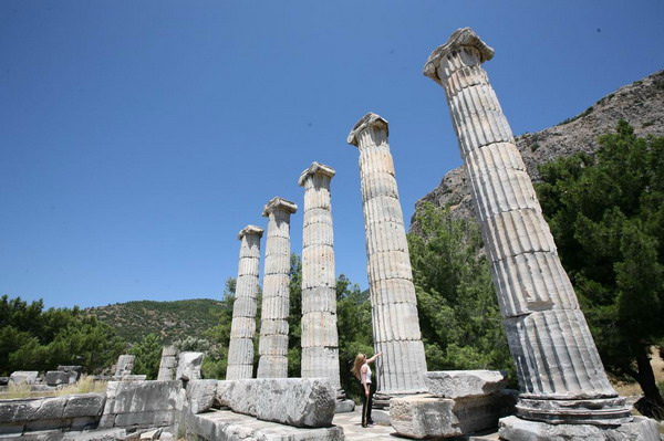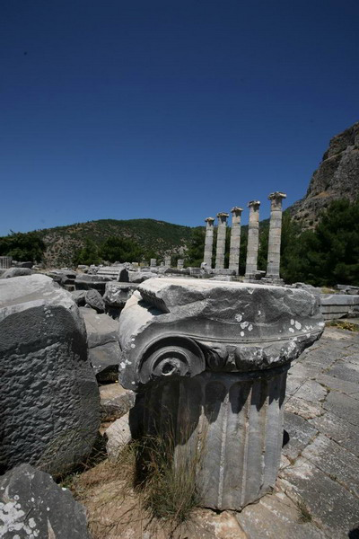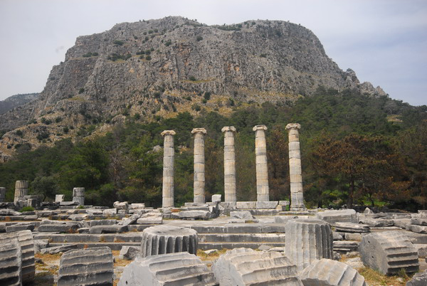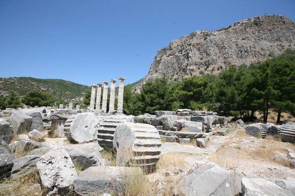 The ruins of the Ionian city of Priene are picturesquely situated on a slope of Mykale mountain. They provide a spectacular lookout point over the plain where the river Meander finds its way to the Aegean Sea. The city is home to an important temple of Athena and its well-preserved remains are a major source of information about ancient Greek town planning.